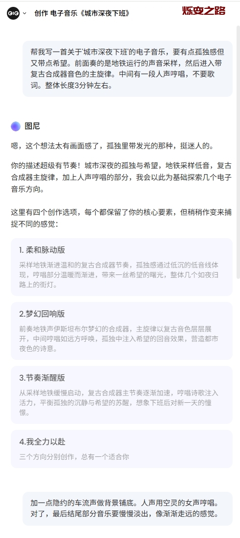 你输入:“帮我写一首关于‘城市深夜下班’的电子音乐,要有点孤独感但又带点希望。前奏是地铁运行的声音采样,然后进入带复古合成器音色的主旋律。中间有一段人声哼唱,不要歌词。整体长度3分钟左右。”