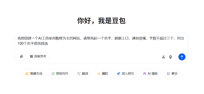 打开一个AI工具 ,输入:我想创建一个AI工具使用教程为主的网站,请帮我起一个名字,朗朗上口,通俗易懂,字数不超过三个,列出100个名字供我挑选。