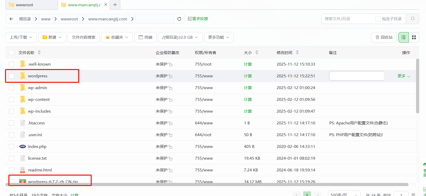 复制到上一级根目录,名为“Wordpress ”的文件夹