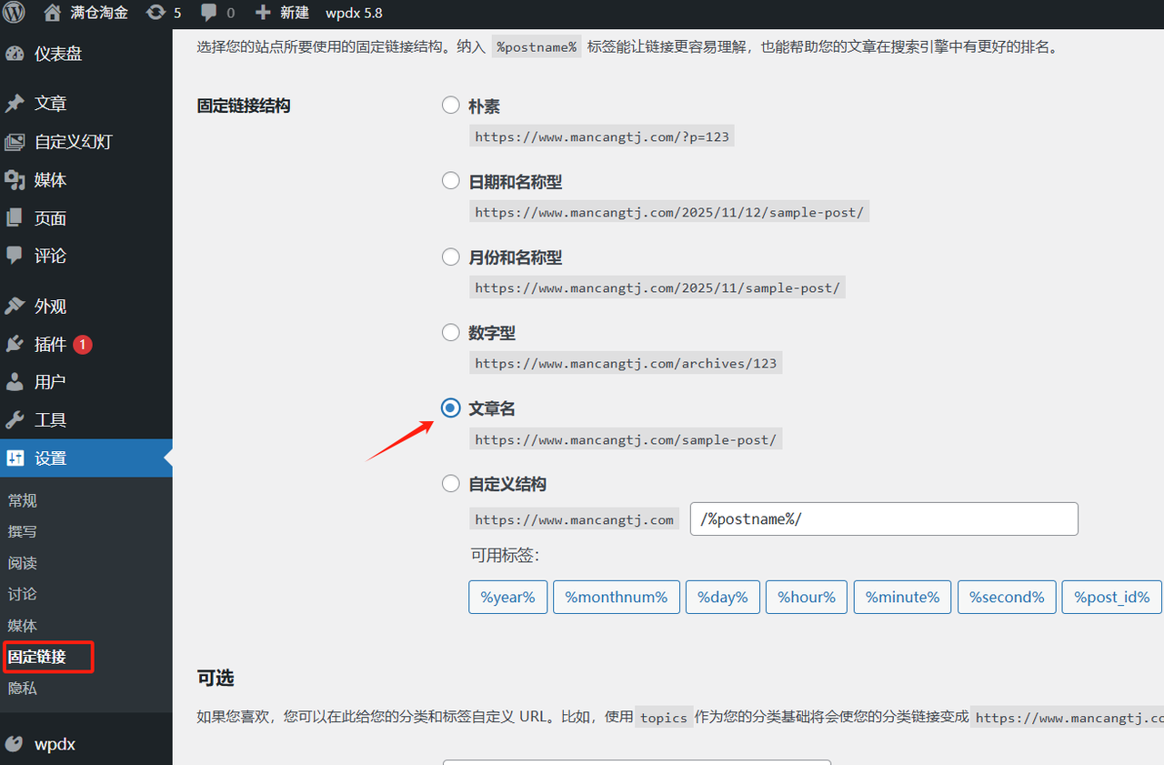 进入网页后台选择设置-固定链接