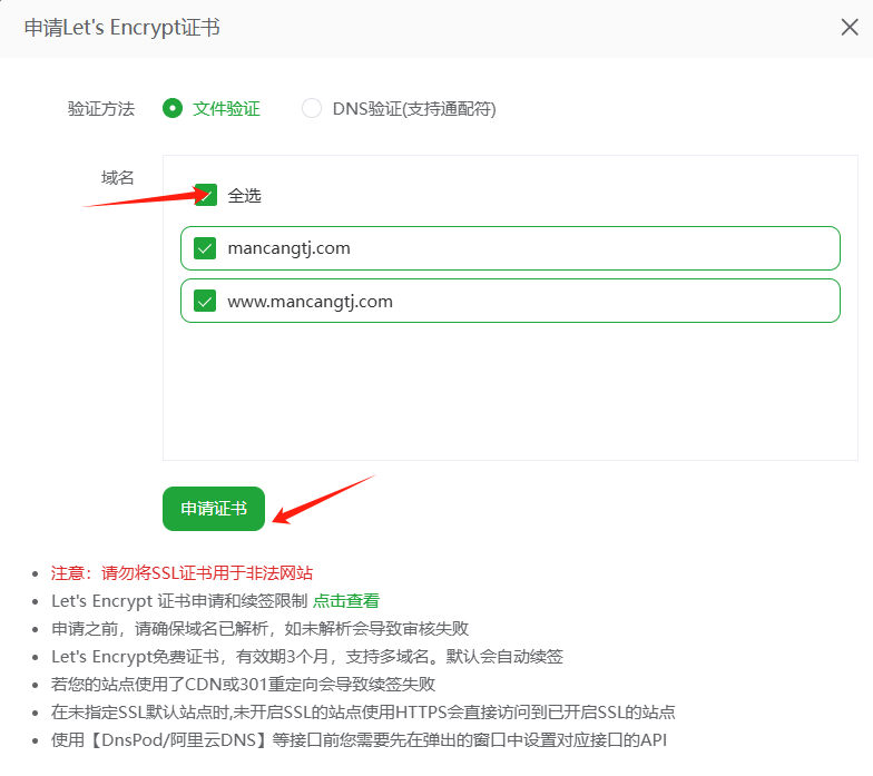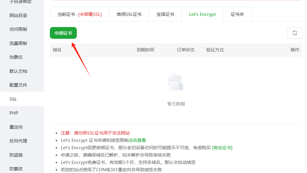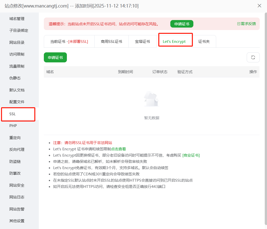 3、域名申请SSL证书,开启网站https协议