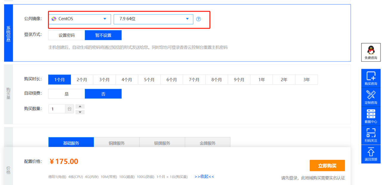 操作系统选择centos 和7.9 64位就行,这个系统是免费的,别的系统会有一定的费用,直接设置一个密码就可以了。