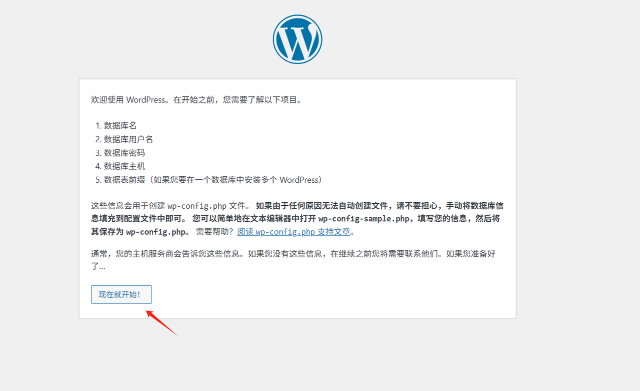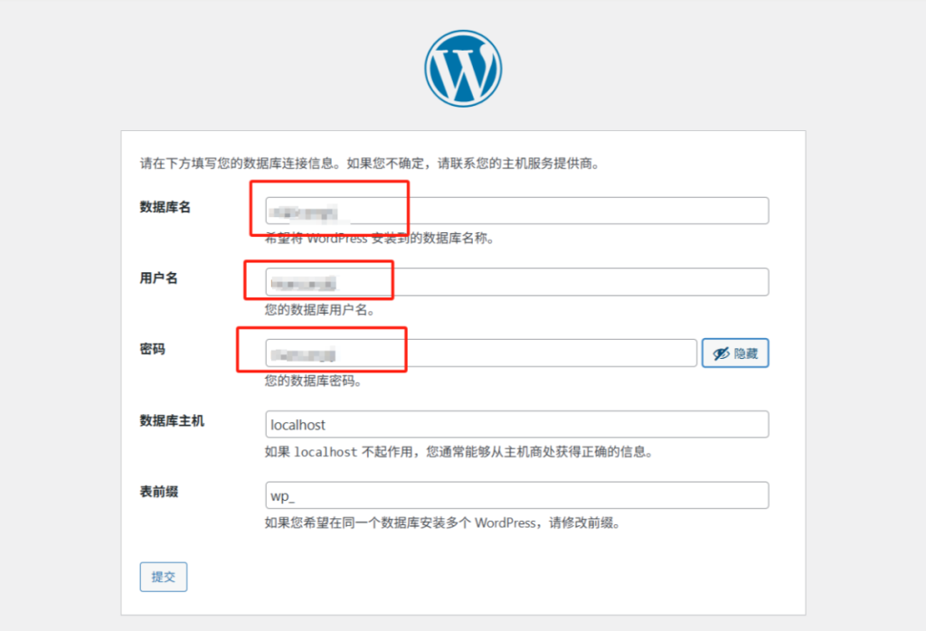 一定要确保wp-config.php 文件中的数据库名称、用户名和密码完全正确。