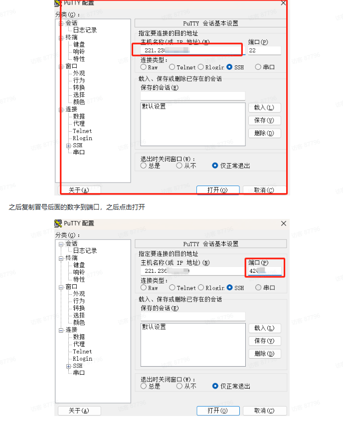 复制公网ip,填写到putty(冒号前面的那一段数字)到主机名称。