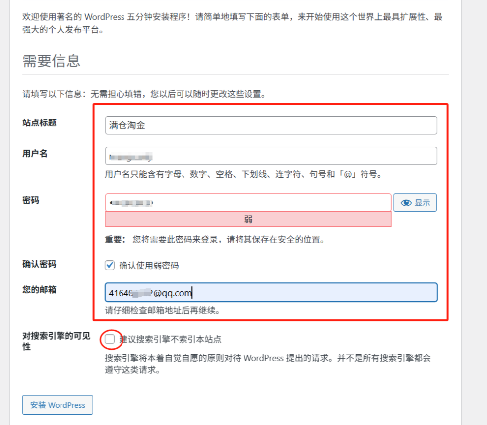 填写网站的一些信息,后期都能改,但最好是记下来省的麻烦,然后点击开始安装。
