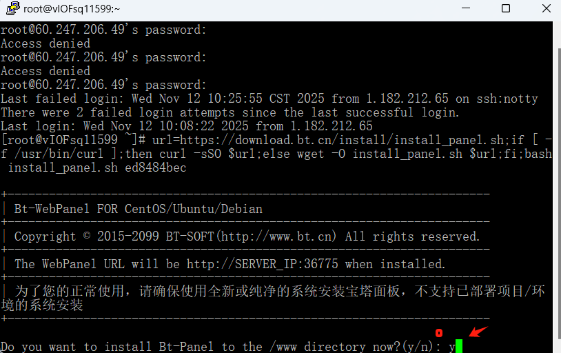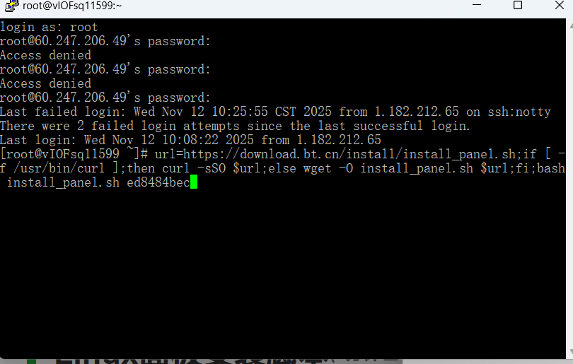 2、输入宝塔的远程下载、安装命令