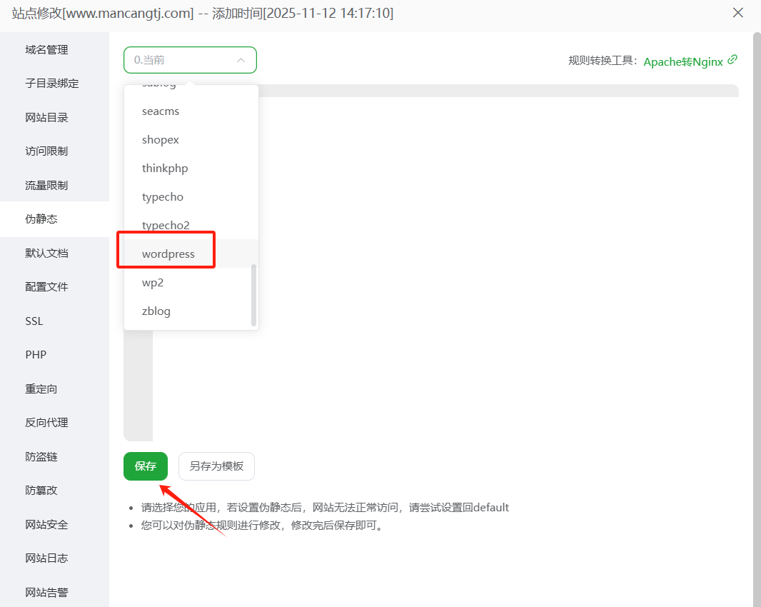 进入到宝塔面板、点击左侧“网站”,到最右边找到“设置”,点开弹窗,找到“伪静态”,点击,然后在下拉框里面找到“WordPress”。