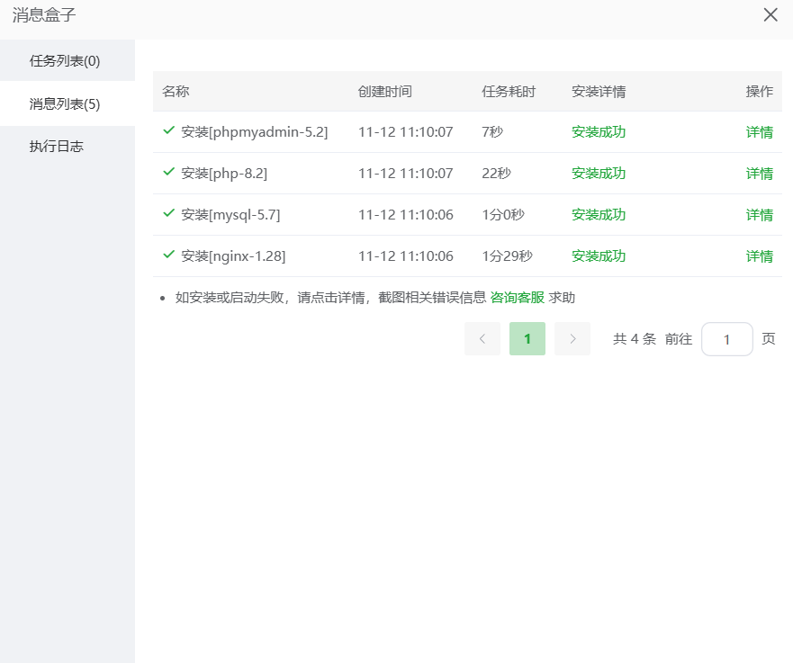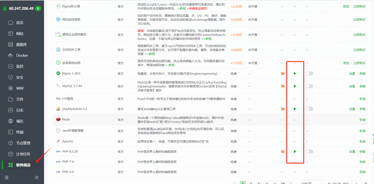 安装完成之后,到宝塔页面下方“软件商城”看下:这四个软件都是绿色的说明安装正确了