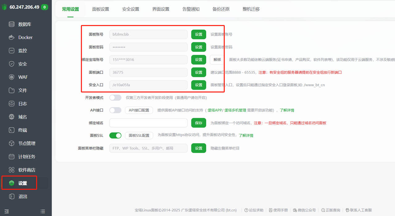 然后在宝塔“设置”里可以改成你熟悉的账号密码,并记录只要做到你别给忘掉就行,一定要记住。