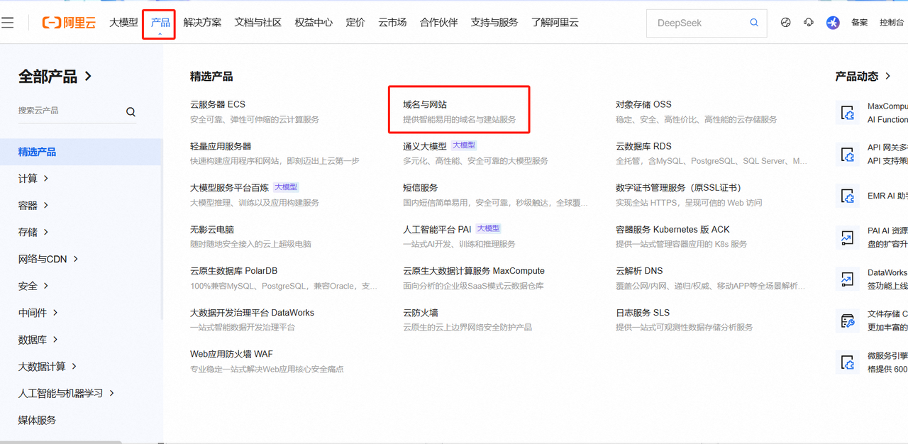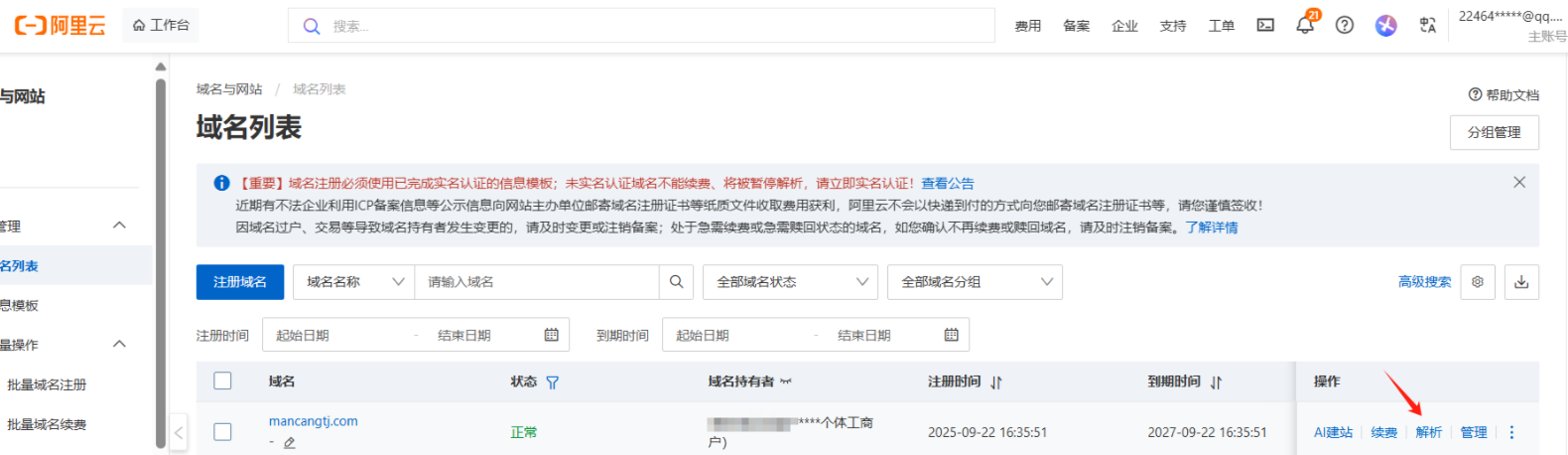 我们打开阿里云 网址:https://www.aliyun.com/ 并进行登录,找到自己的域名。