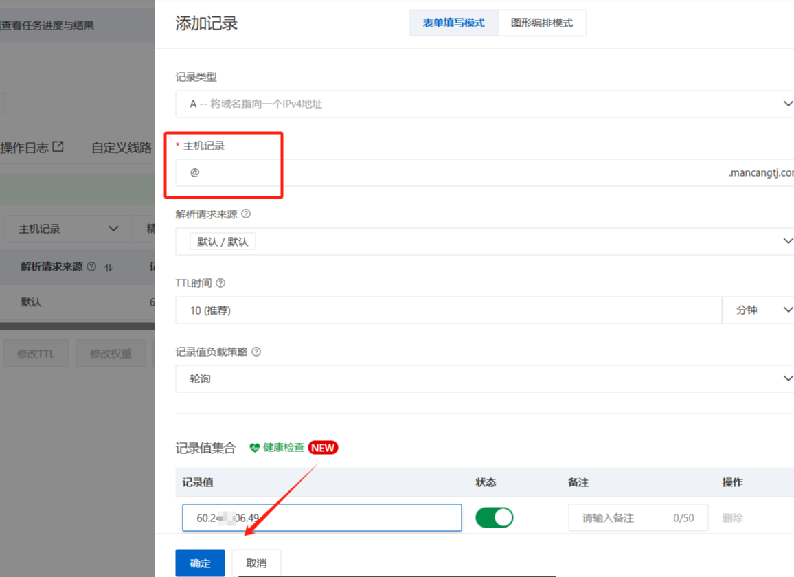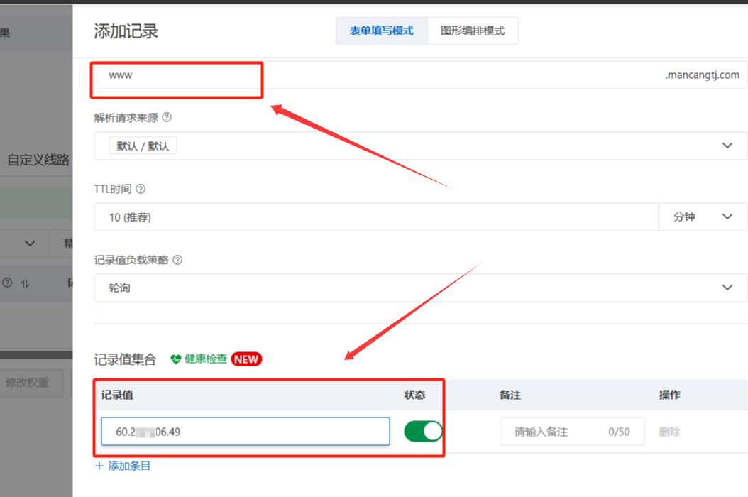 输入“www” 下面的记录值就输入ip地址,也就购买VPS主机的IP地址。(点击确定)