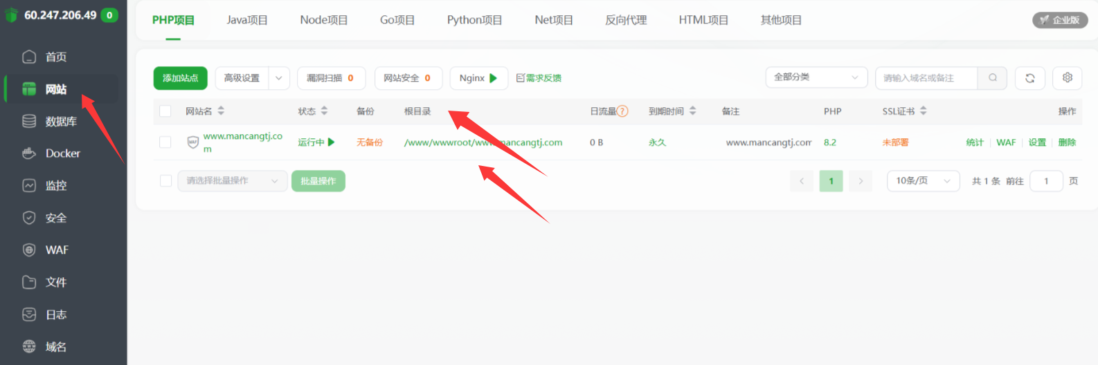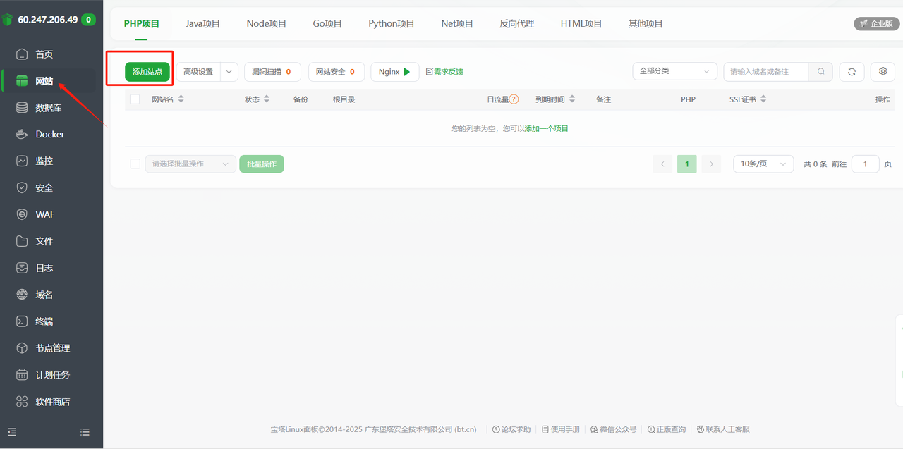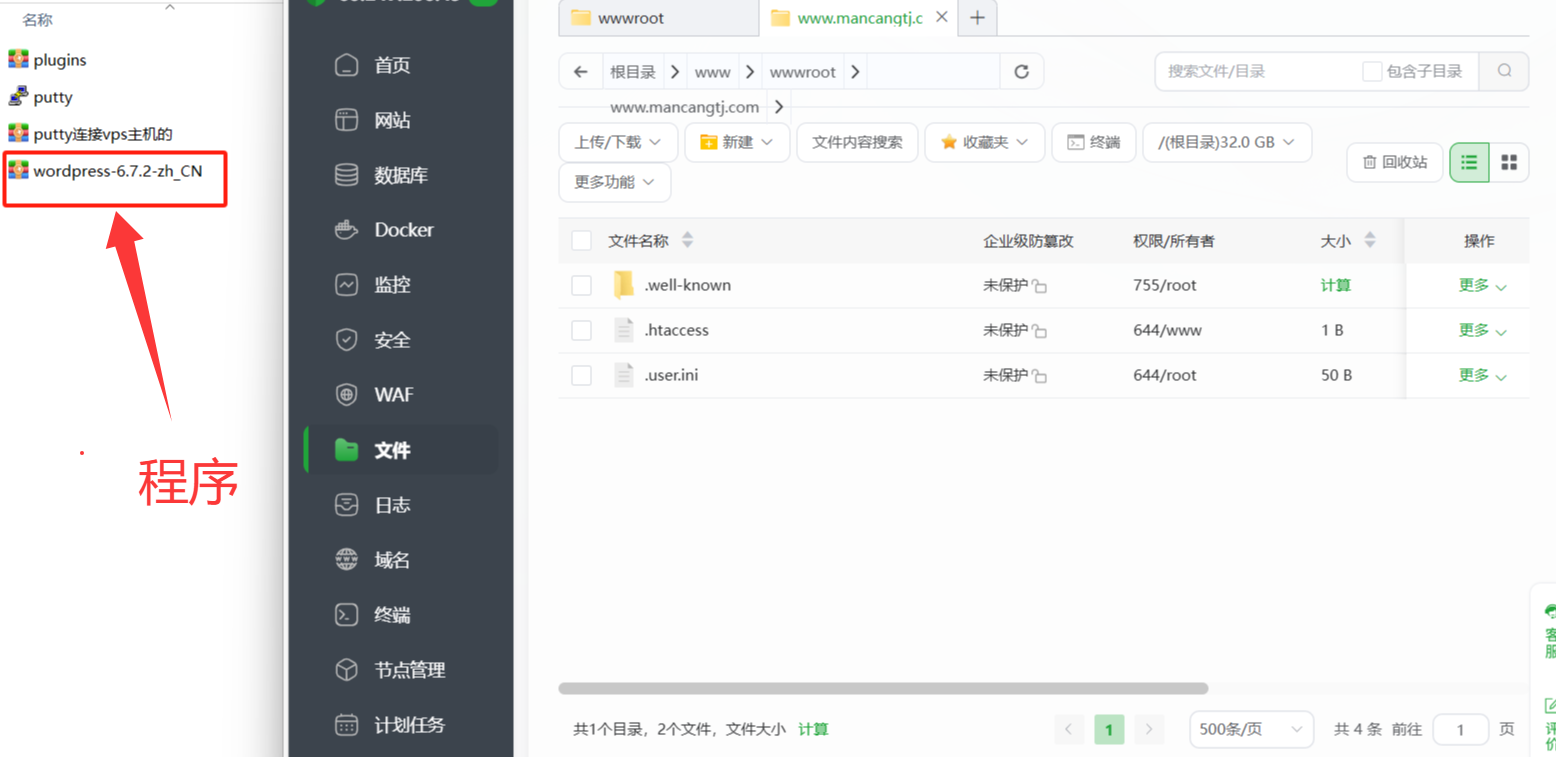 下载程序之后,即可进入到宝塔左侧——网站——根目录——程序上传。
