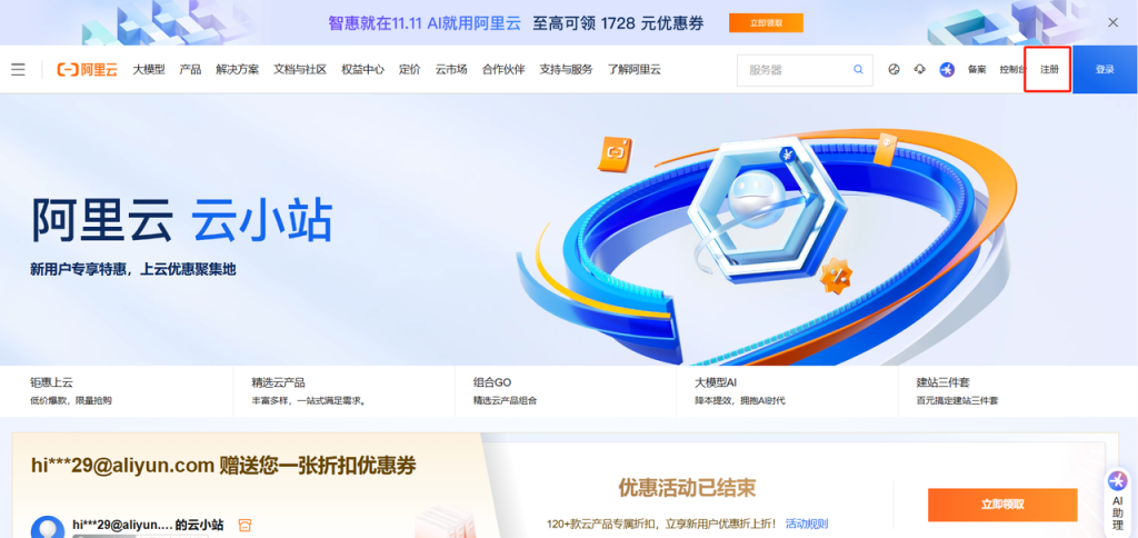 网址:https://www.aliyun.com/ ,我们要先去注册一个账号。(就用我们的注册的营业执照去进行实名认证)