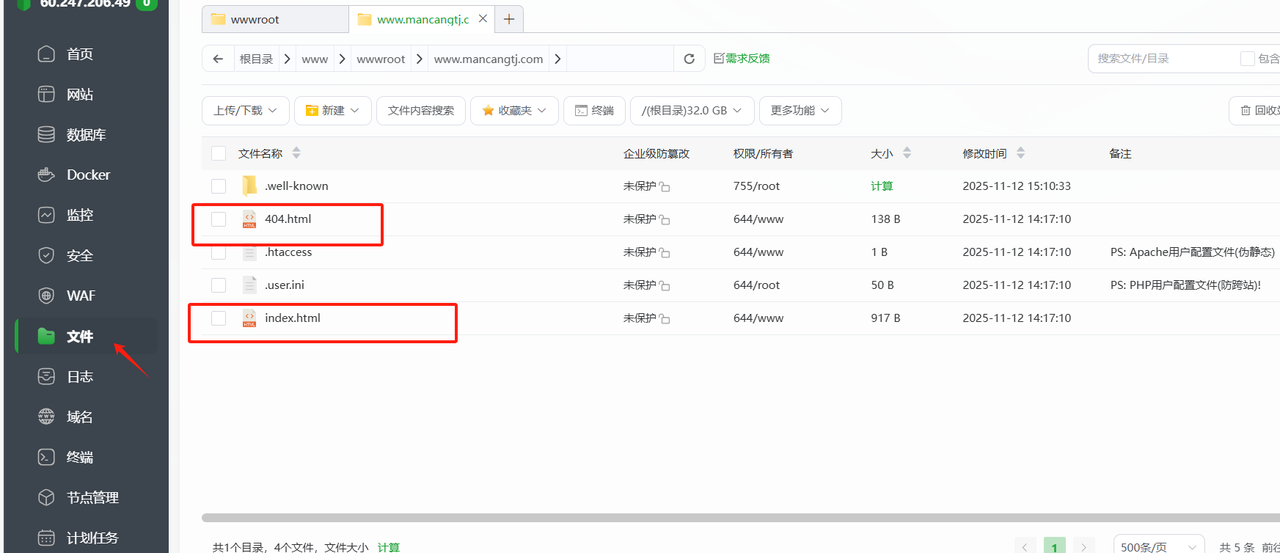 到根目录之后,里面显示2个404文件,删除我标出的这两个文件