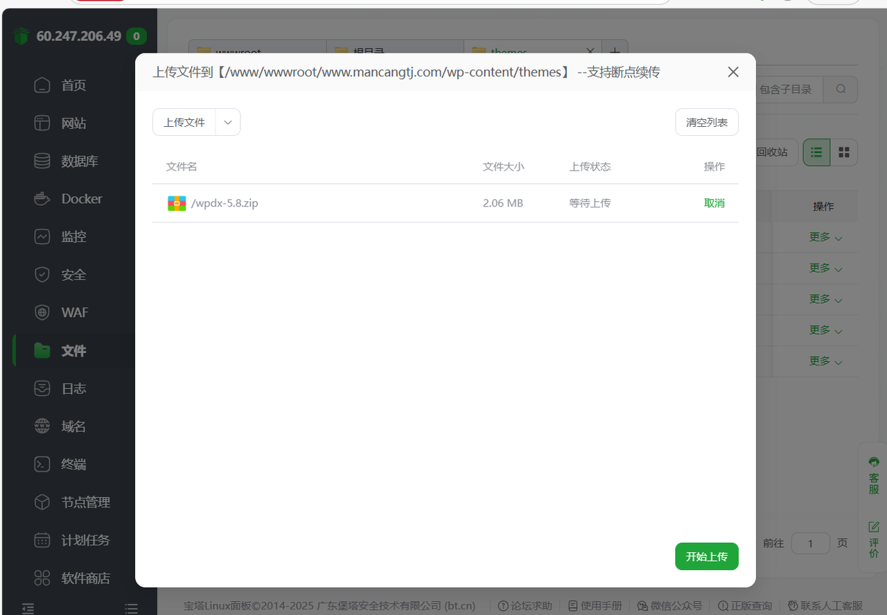 把下载的的文件上传到宝塔网站根目录---找到“wp-content”文件---上传主题---解压---完成