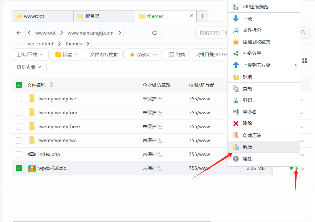 压缩文件直接拖入根目录,之后在根目录中默认路径解压。(压缩文章可以删了)