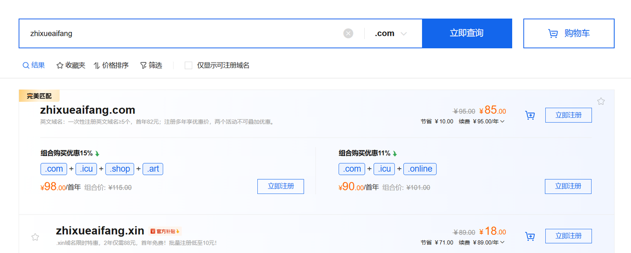 三字名实在不好找,就只能去注册四字域名了,像这个 “智学ai坊”就没人注册过,我们就可以进行购买了。